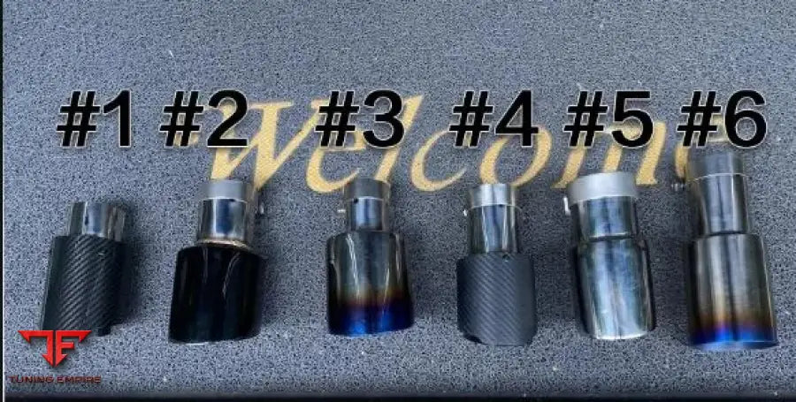 Selection of various exhaust tips : stainless silver, black, blue torched, carbon fiber, custom
